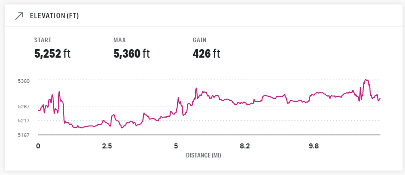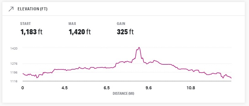 Note the maximum elevation of 1,420 feet at around mile 9, and a sharp increase and decrease before it. That is the hill just east of Papago Park Military Reservation, and the-out-and-back on the road that covers it. (Also note the overall gradual uphill for the first half of the course, and the overall gradual downhill for the second half of the course.)