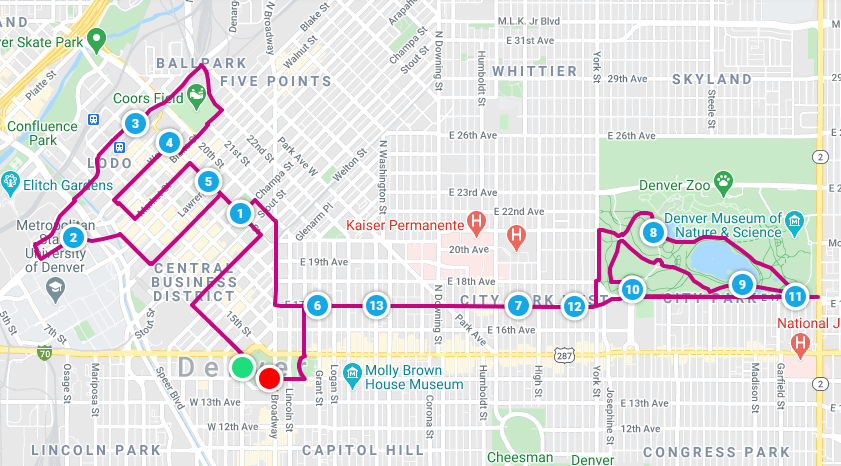 And then the horn and the start. The temperature and wind in Denver at 7:00 A.M. on October 20, 2019 were a high of 48 degrees Fahrenheit with scattered clouds and a strong 20 m.p.h. west wind, which was a tailwind for the first half of the course and a stiff headwind for the final 3.1 miles. My watch splits were a steady 5:35 throughout—well outside 4:52, and so I was confused to read 77 minutes on the finish line clock. Turns out the course was long—0.64 miles long, to be exact. That converts my 77:28 (5:50/mile) to 73:42 (5:38/mile). Course maps and elevation profile below.