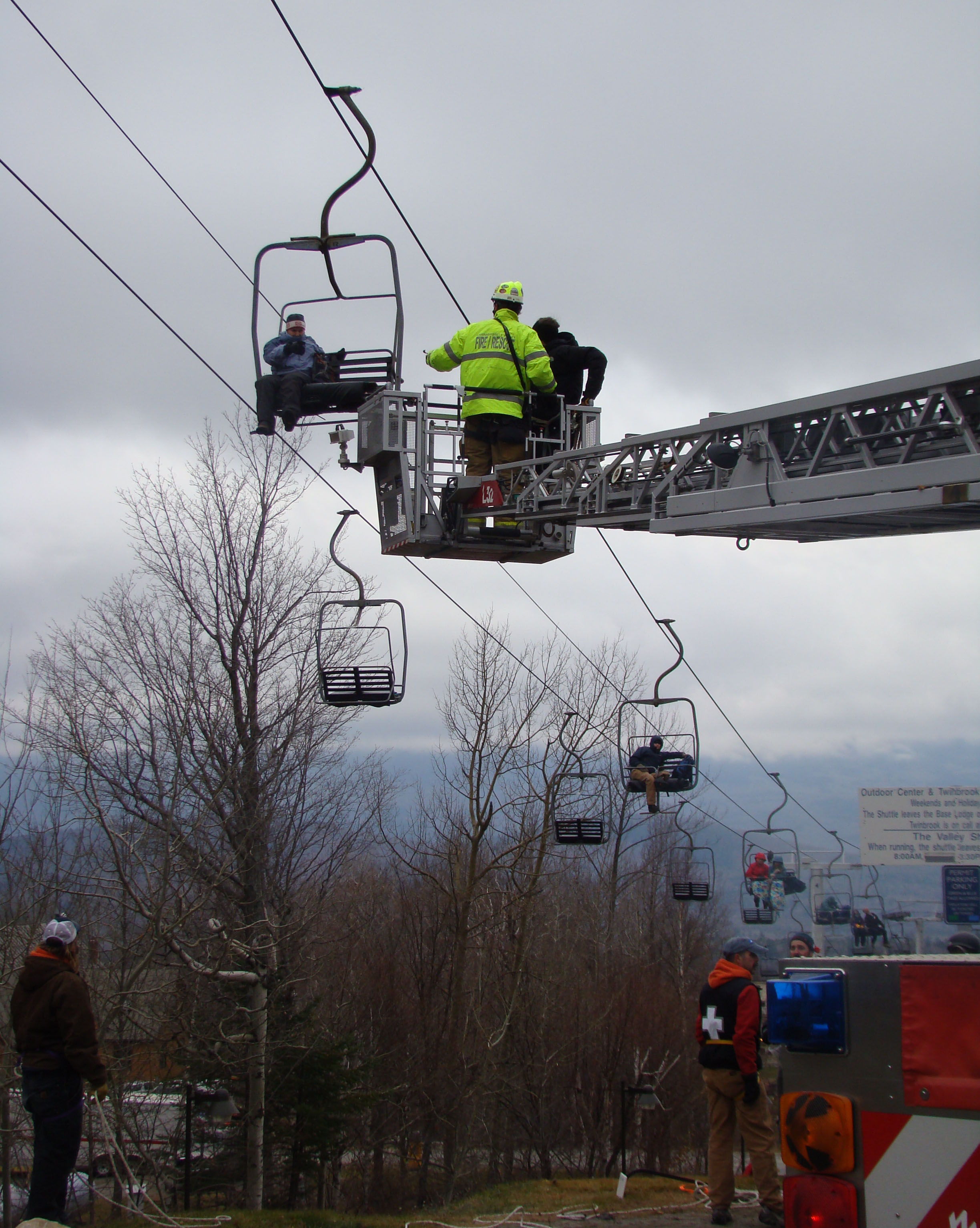 On the mountain, those in chairlifts downloaded via either fire truck bucket or rope harness, and the drill finished at around 11 a.m., two hours earlier than expected. Back inside the base lodge, volunteer participants warmed up while emergency responders debriefed. Delinda Smith of the Sugarloaf Ski Club was the last one off Sawduster. “It was cold,“ she said. “But it was fun.” Joked her husband Peter, “I volunteered her.”